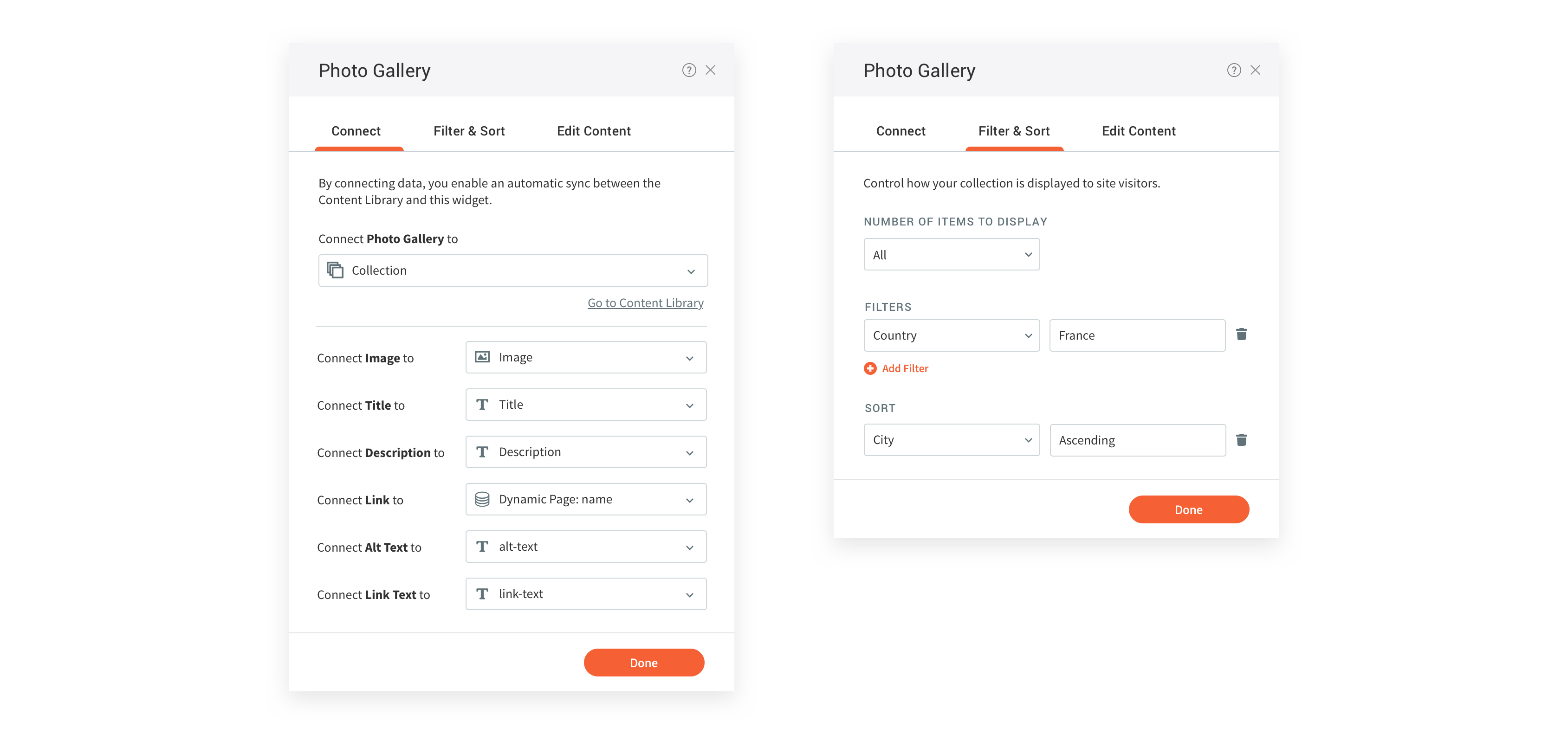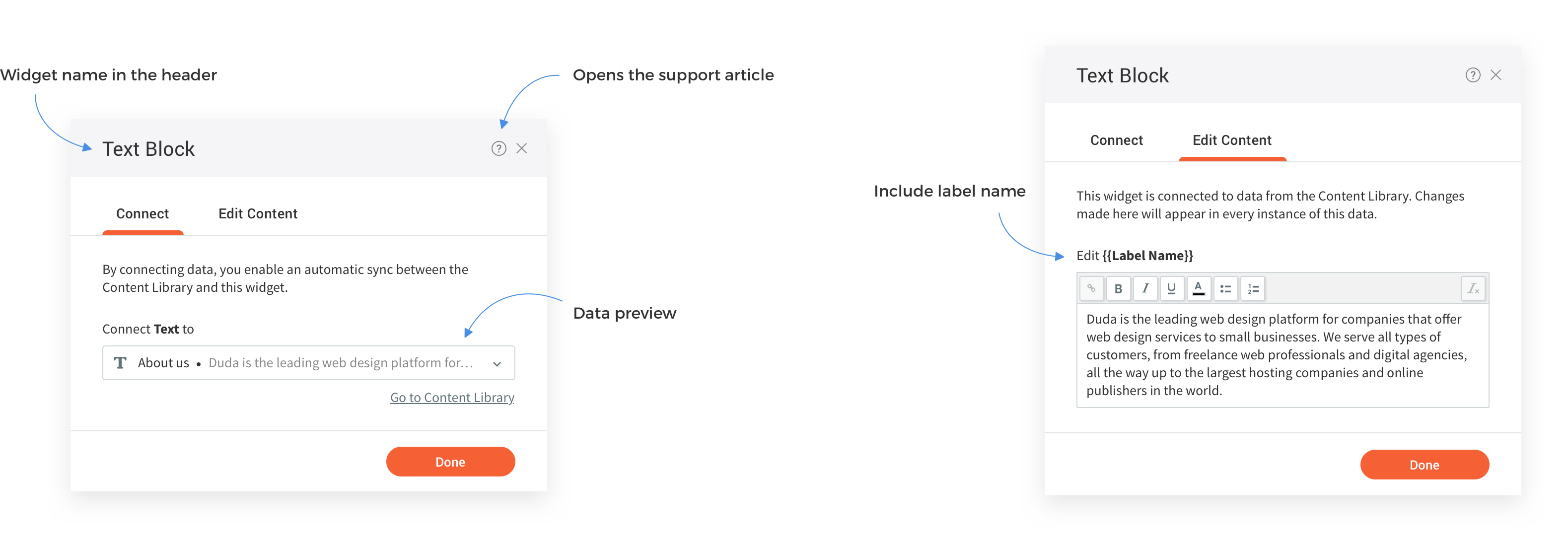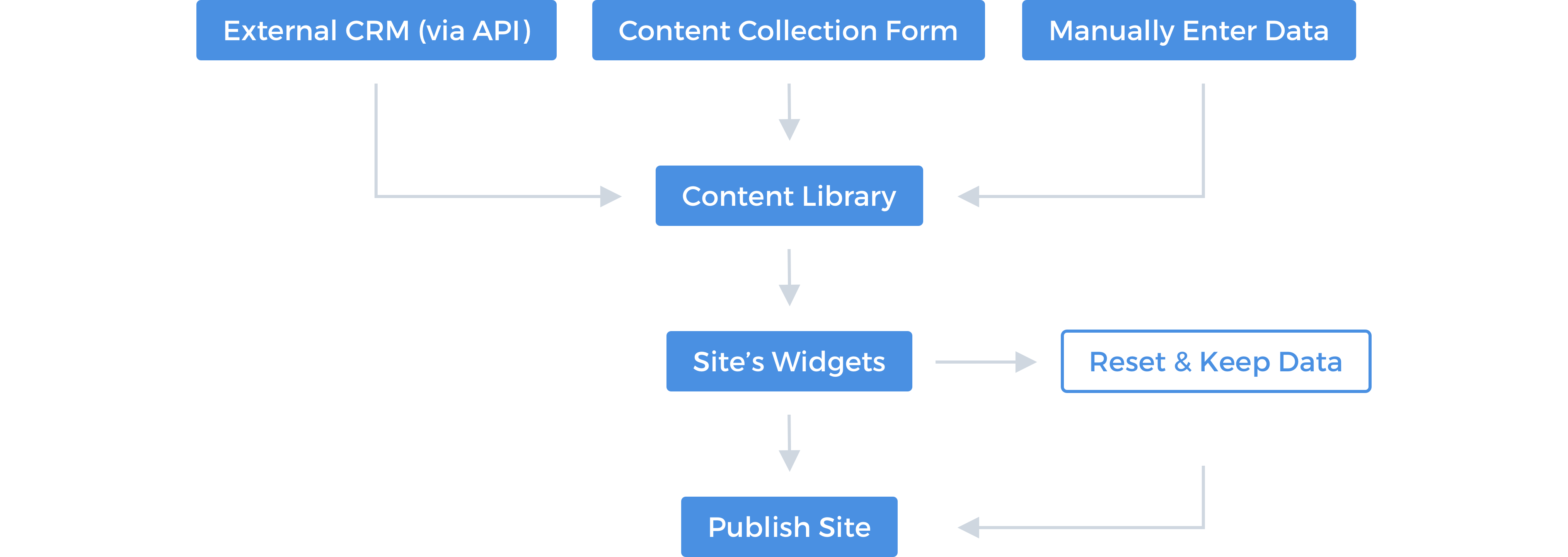 There are 3 ways to populate the content library with data: 1 - send data via API - this can be an API call or an integration from the clients side that automatically sends a call every time a client update their CRM. 2 - Fill in the content collection form - a built in form in Duda's platform that a customer can send to their clients to fill in. Once submitted, the form's content will populate the content library. 3 - Connect widgets. This can be done after the content library already has data or in advance using Template Mode, when the content library is still empty.