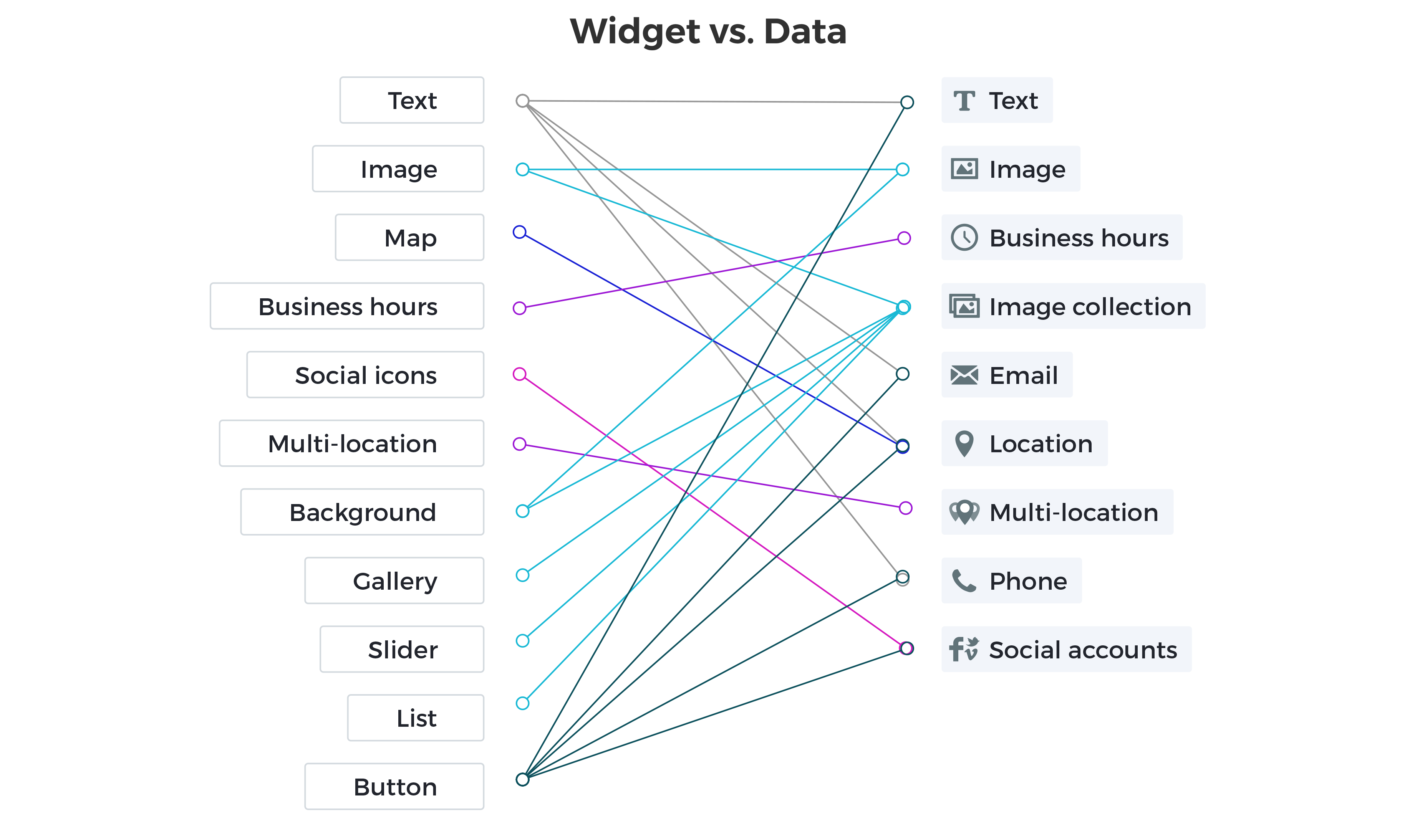 We created mapping between our existing widgets and the content library data, to allow connecting specific data types to specific widgets. For example, data types such as text, email, phone and location can connect to the text widget - but can also be displayed as a map (location) or a button (to email/call).