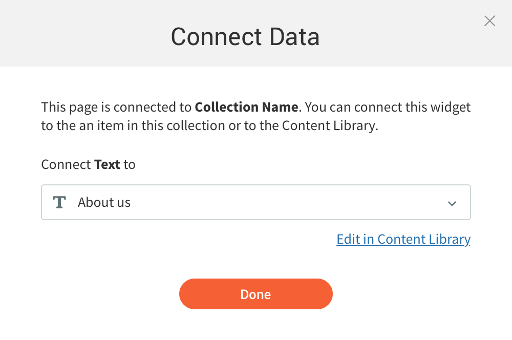 First version of the modal only allowed connecting between a widget and the data type. The data is viewed in the site editor once the widget is connected.