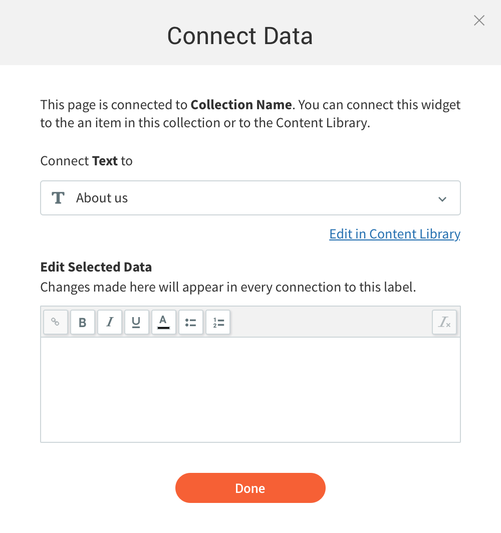 The second version of the modal included both connecting the widget and then editing its content. The content editor would appear once the data is selected.