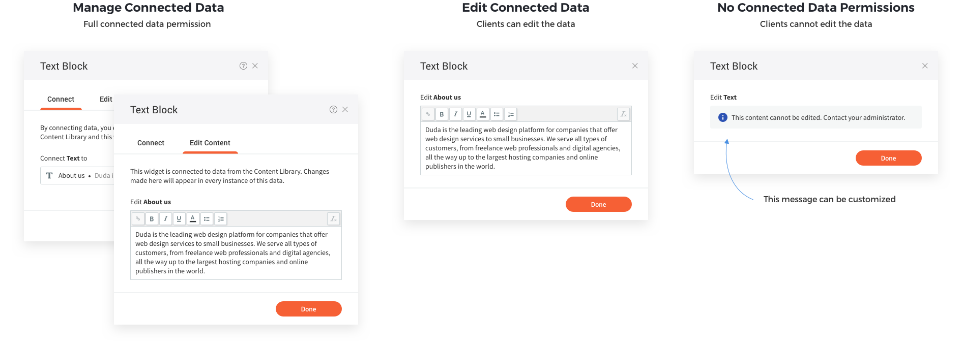 Connected data allows connecting between external data sources and the elements on the website, to auto-populate the elements on the website with data from external sources. Connected data - use Duda's content library and API capability to allow populating sites with customer data and business information. This improved the process of website building and made it more efficient.