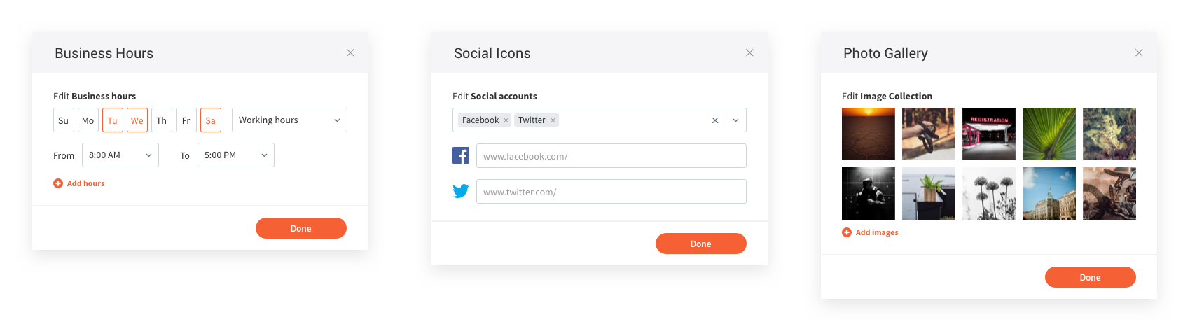 Based on the widget-data type mapping, each data type has a dedicated content editor. This opens when you click on the connected popup. This allows users to edit the data from the popup instead of navigating to the content library. The different editors include plain text, rich text, image and image collection, business hours, location, social icons and more.